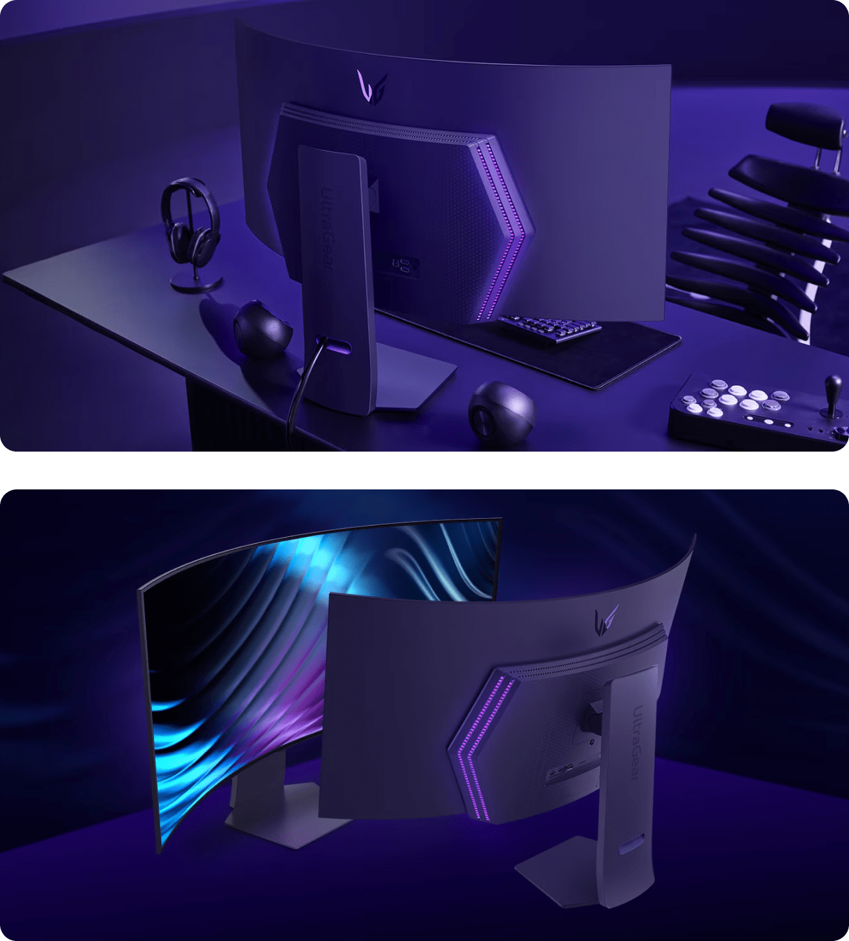 Монітор UltraGear переосмислено з шестикутним дизайном Unity. Створіть свій ігровий простір з обтічним, унікальним виглядом. L-подібна підставка займає мінімум місця на столі, забезпечуючи комфортне ігрове середовище.