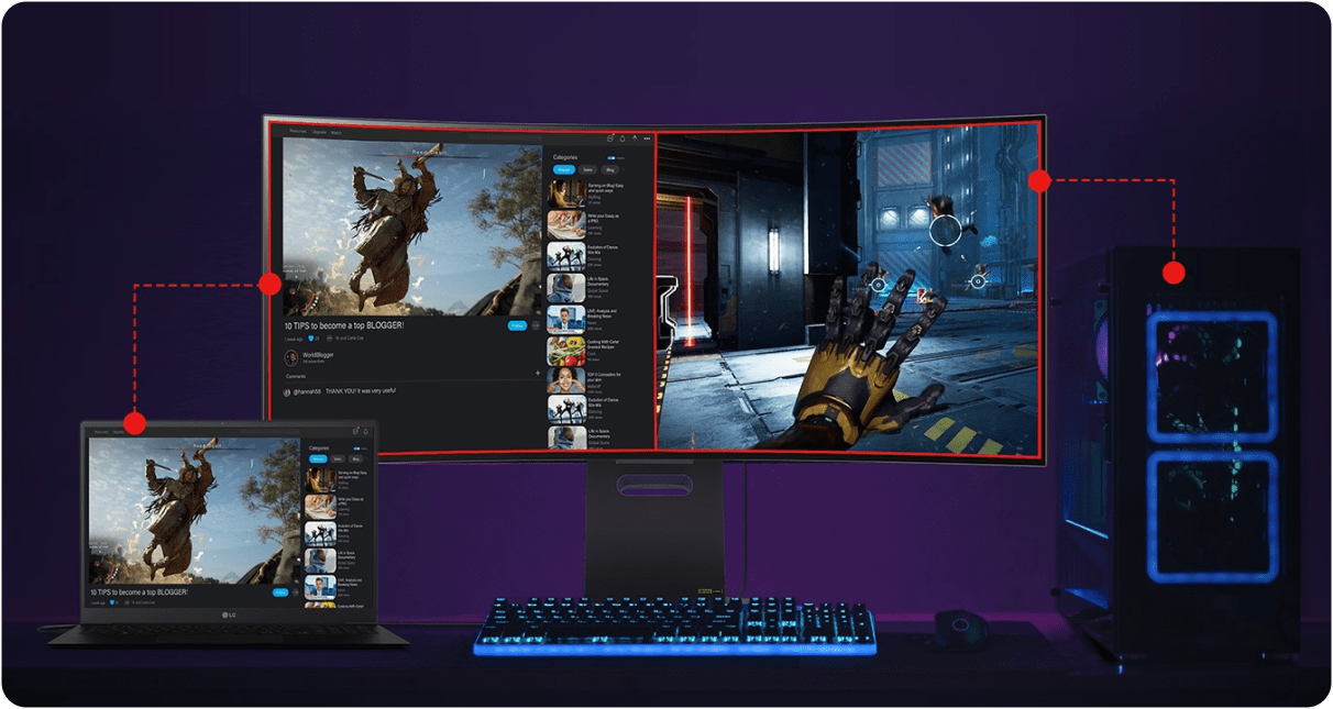45-дюймовий дисплей забезпечує неперевершені та приємні враження від перегляду. 45-дюймовий екран зі співвідношенням сторін 21:9 на 12% більший за 49-дюймовий 32:9, пропонуючи збалансоване співвідношення сторін як по вертикалі, так і по горизонталі, що дозволяє гравцям повністю зануритися в деталі з першого погляду. Крім того, співвідношення сторін 21:9 є ідеальним варіантом для геймерів, оскільки більшість ігор підтримують цей формат частіше, ніж 32:9.
