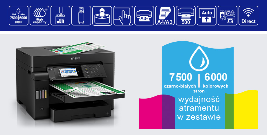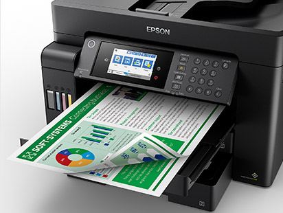 Epson L15150 пропонує друк, копіювання, сканування та факс формату A3+. Керування просте та інтуїтивно зрозуміле завдяки легкочитаному сенсорному РК-екрану діагоналлю 10,9 см.