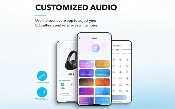 Додаток SoundCore Space Q20i, сумісний з цією моделлю навушників, дозволяє легко налаштувати параметри звуку відповідно до ваших потреб. Ви можете використовувати такі функції, як регульований еквалайзер та опція білого шуму, щоб досягти глибокого розслаблення. Soundcore Q20i дивує інноваціями на кожному кроці!