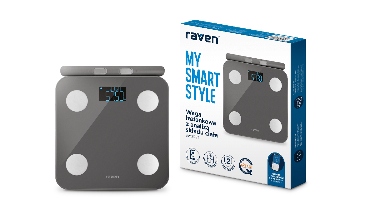 Ваги для ванної кімнати Raven EW012BT з аналізом складу тіла мають голосові підказки польською мовою та сповіщення про перевантаження та низький заряд батареї. Це інтуїтивно зрозумілий пристрій, який значно спрощує процес догляду за вашим здоров'ям.
